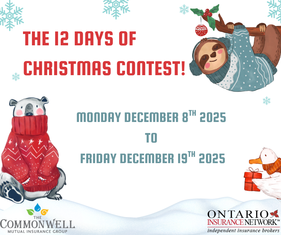 Ontario Insurance Network and The Commonwell Mutual Insurance Group invite you to participate in our 12 Days of Christmas Giveaways Contest! The contest will run from December 8th 2025 to December 19th 2025. Each day we will give away a $100 gift card to a member of our community, chosen by random draw, and the winner will also be able to choose a registered charity of their choice, where Ontario Insurance Network will donate $100 0n the winner’s behalf.